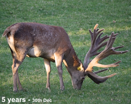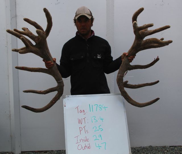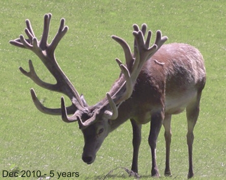 General Peel continues to be a very important sire at Peel Forest Estate. He possesses all the criteria to cross with multi-pointed, top English bred deer. He has huge beam, massive long lower tynes and a very clean, long main beam length. General is a big bodied stag who has excellent breeding values for 12mth growth. (+10.06). He is a beautifully natured Sire who is easily worked on his own with full antler. He has impressive 15 inch burrs, 25 inch brows and 28 inch bays. Fully stripped General is a sight to behold. A stag who is certainly leaving a stamp on the style and mass here at Peel Forest.