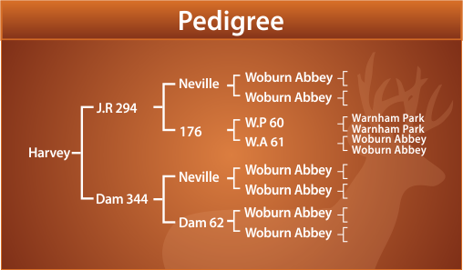 “HARVEY” has been one of the New Zealand deer industry’s leading sires. His extraordinarily heavy antler structure has left its mark on both velvet and trophy genetics now being used in New Zealand. In his prime “Harvey” grew the heaviest velvet for age for any New Zealand Red Stag at ages 6, 7 and 9 years. In 1999 “Harvey” was the Supreme Champion of the National Velvet Competition, with a head weighing 11.59kg @ 9 years. Even now this is still the heaviest red head to ever win the National Velvet Competition. A grandson of “Harvey”, “Austin”, has now also won the National Velvet Competition with a head of 10.86kg S.A.V. at only 6 years of age. A son of “Harvey”, “Kane” was second in the National Velvet Competition Hard Antler section at only 5 years of age, with an S.C.I. score of 544. “Harvey” died at 17 years, he was truly one of our “Industry Greats” HARVEY PERFORMANCE