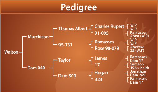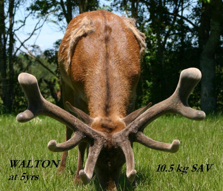 “WALTON” is undoubtedly one of the most outstanding young sires that we have ever bred. He is a son of MURCHISON out of an outstanding daughter of TAYLOR. He has now grown the industries heaviest ever two and three year old velvet (to our knowledge). He won the National 2yr old Velvet Competition and the 3yr old class of the North Island Velvet Competition. He is a heavy bodied stag with an extremely gentle nature.